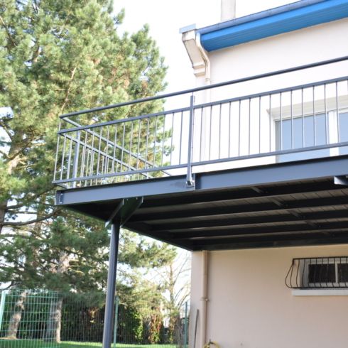 Terrasse métallique avec plancher lames composite et garde-corps